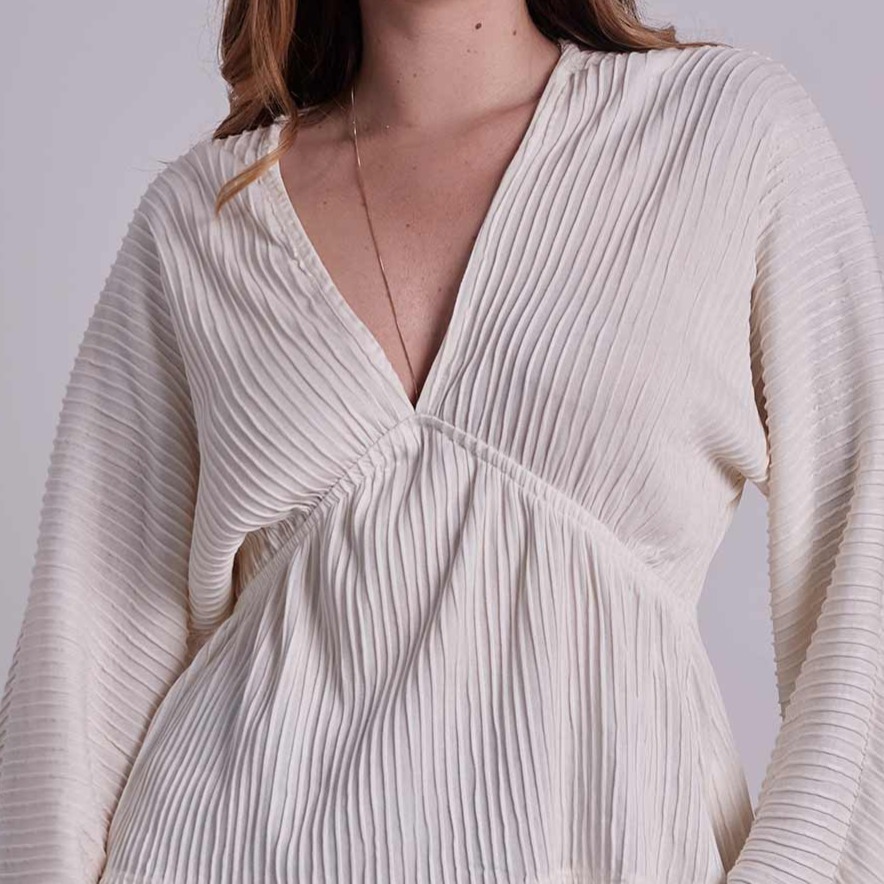 o decote v traz elegância, enquanto as mangas amplas criam uma delicadeza romântica. a peça é leve, confortável e respirável daquelas que abraçam sem apertar e funcionam em qualquer estação.