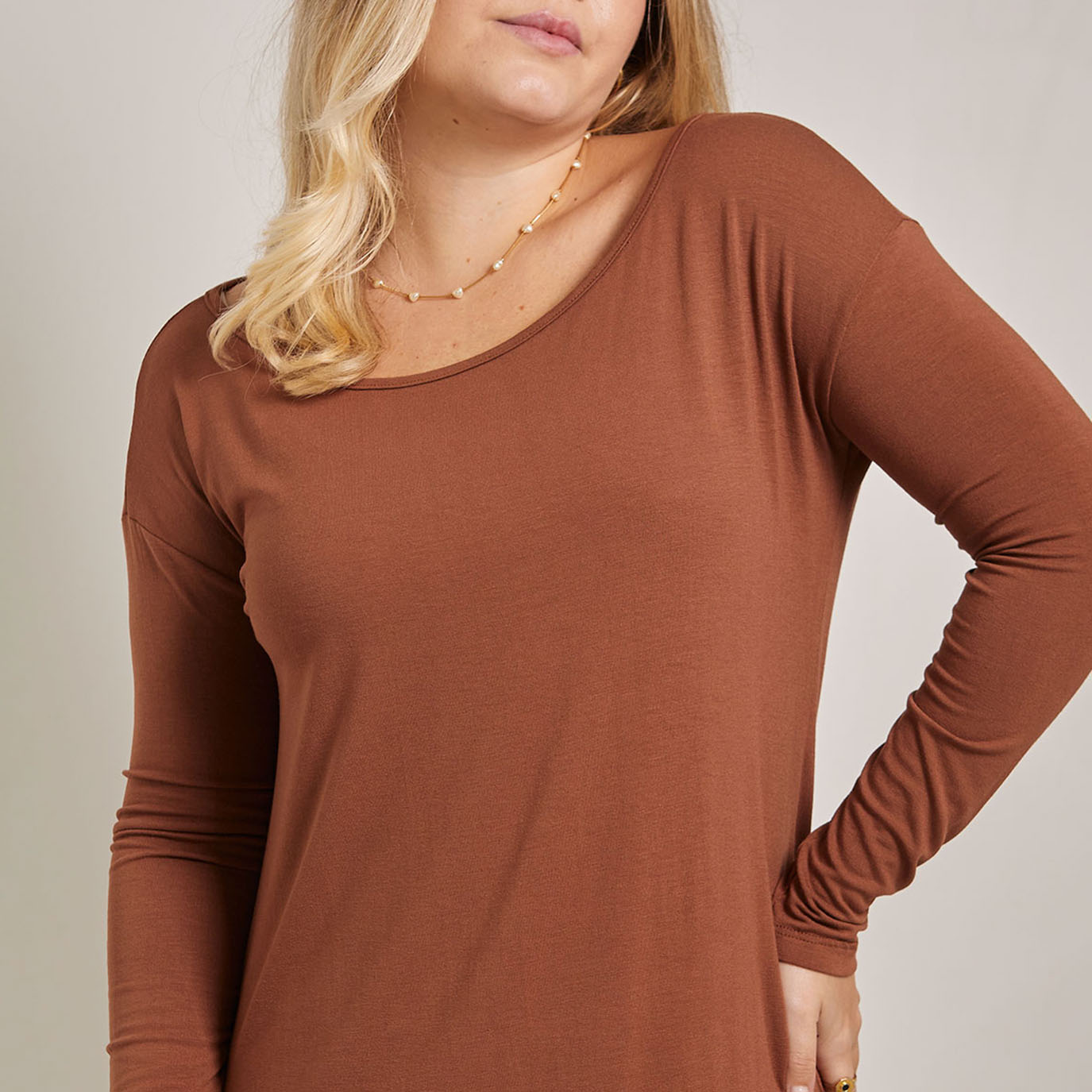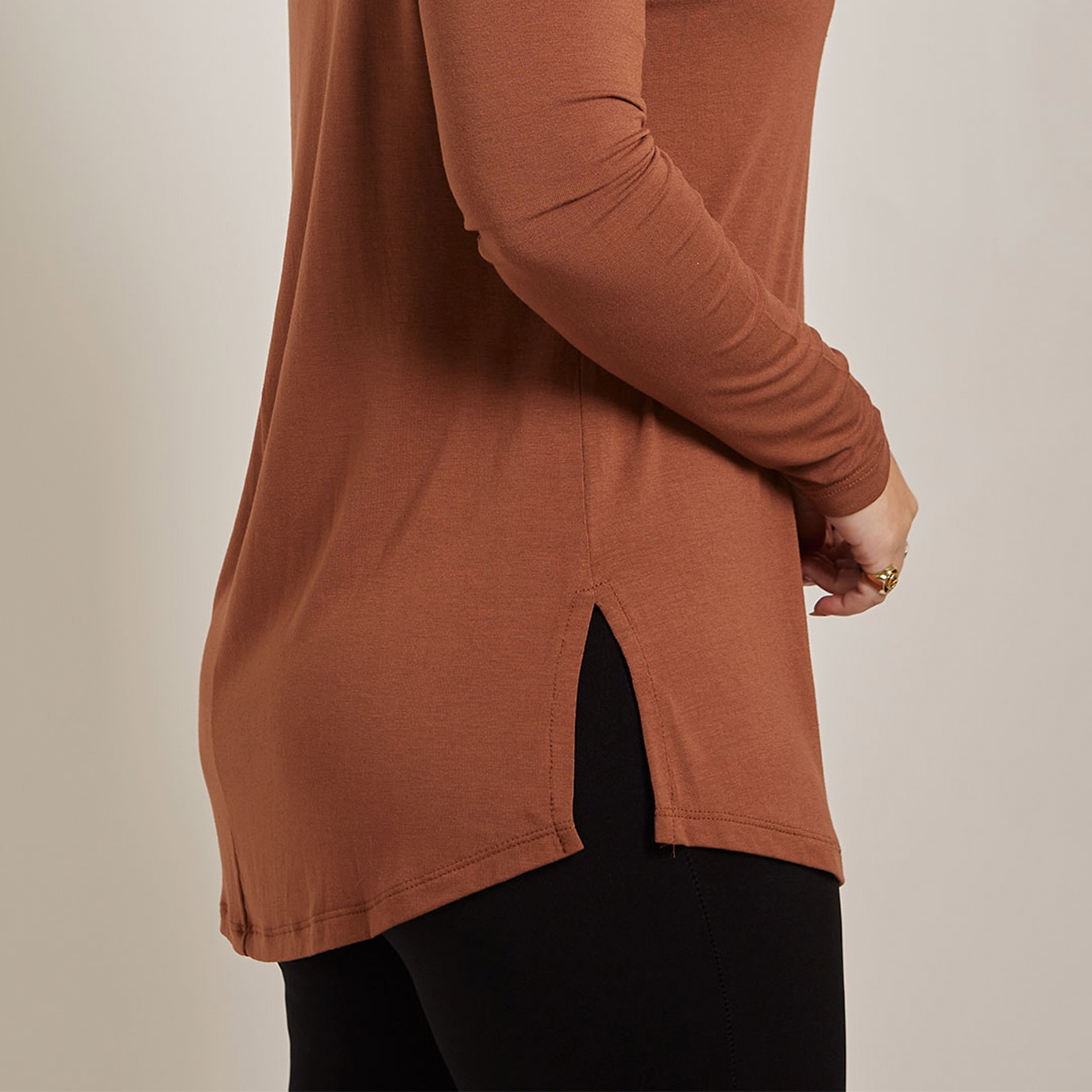 um básico leve e fácil de amar. a cecília tem mangas longas, decote canoa e comprimento alongado com fenda lateral. feita em viscotricot macio e fresquinho, é aquela blusa que acompanha tudo — da rotina ao descanso, do look comfy ao arrumadinho.