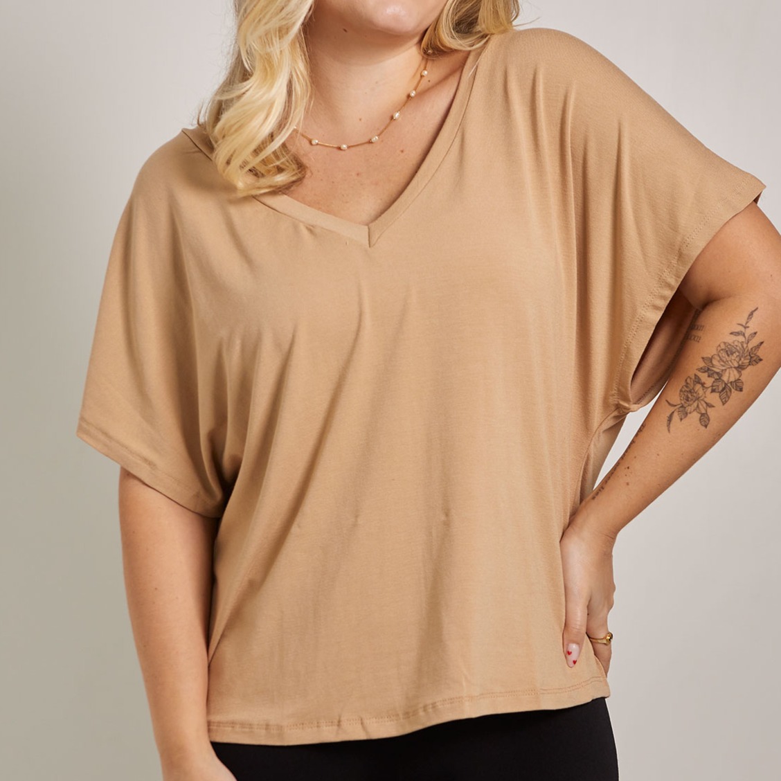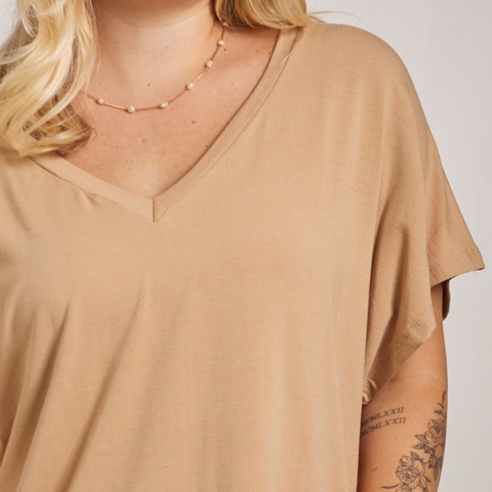 a modelagem ampla veste com fluidez, garantindo liberdade de movimento e sensação macia na pele. o decote em v alonga o pescoço e valoriza a parte superior do corpo, enquanto as mangas curtas tornam a peça perfeita pra usar em dias de calor.
