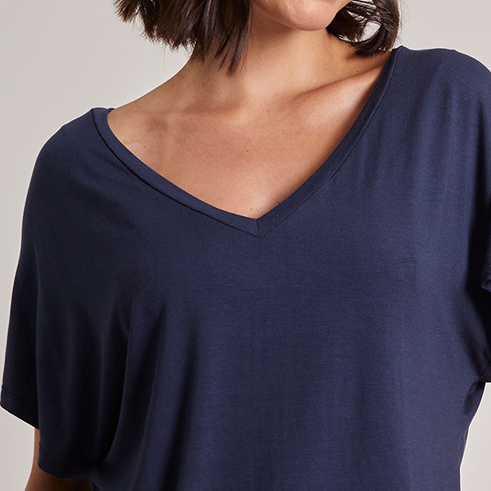a modelagem ampla veste com fluidez, garantindo liberdade de movimento e sensação macia na pele. o decote em v alonga o pescoço e valoriza a parte superior do corpo, enquanto as mangas curtas tornam a peça perfeita pra usar em dias de calor.