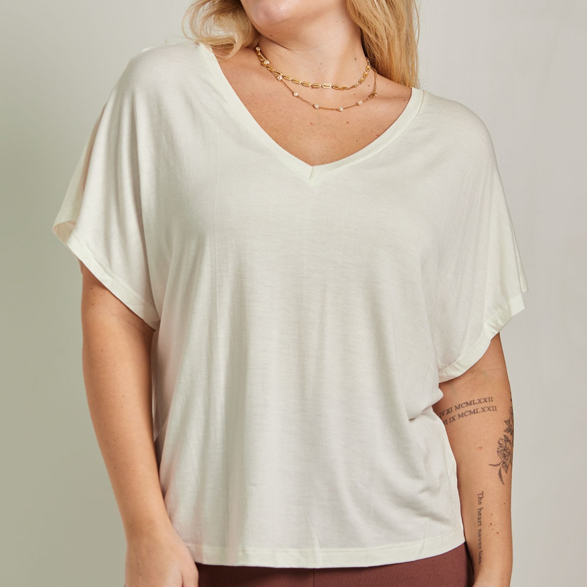 a modelagem ampla veste com fluidez, garantindo liberdade de movimento e sensação macia na pele. o decote em v alonga o pescoço e valoriza a parte superior do corpo, enquanto as mangas curtas tornam a peça perfeita pra usar em dias de calor.