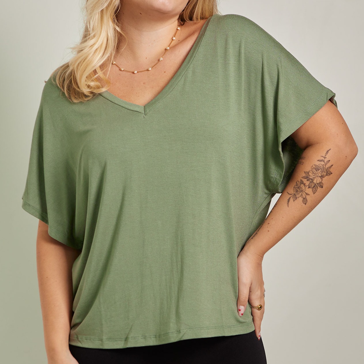 decote que diz tudo o decote em v dá aquele toque sofisticado e alongado, valorizando o colo e deixando o visual leve — o equilíbrio perfeito entre o casual e o chique. |