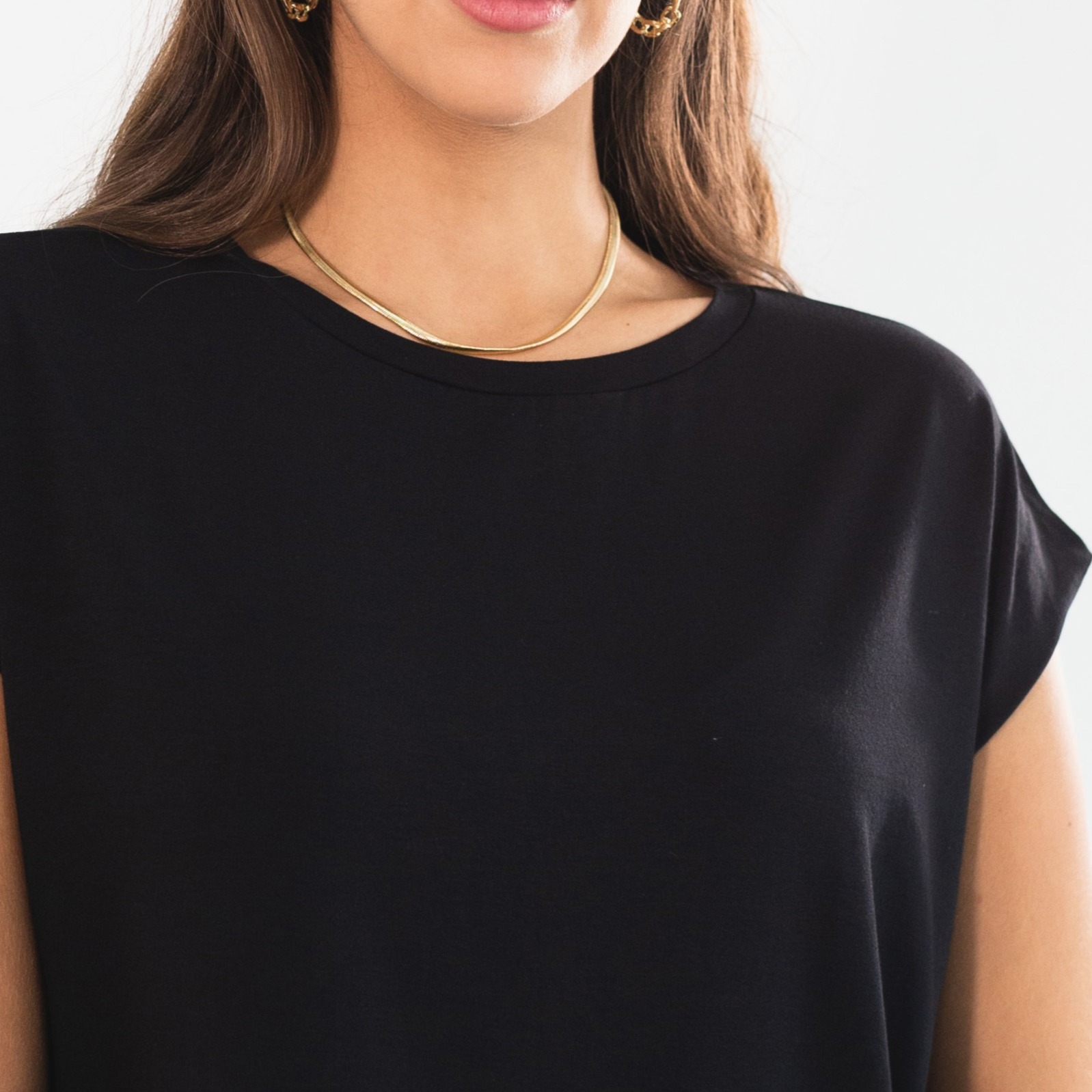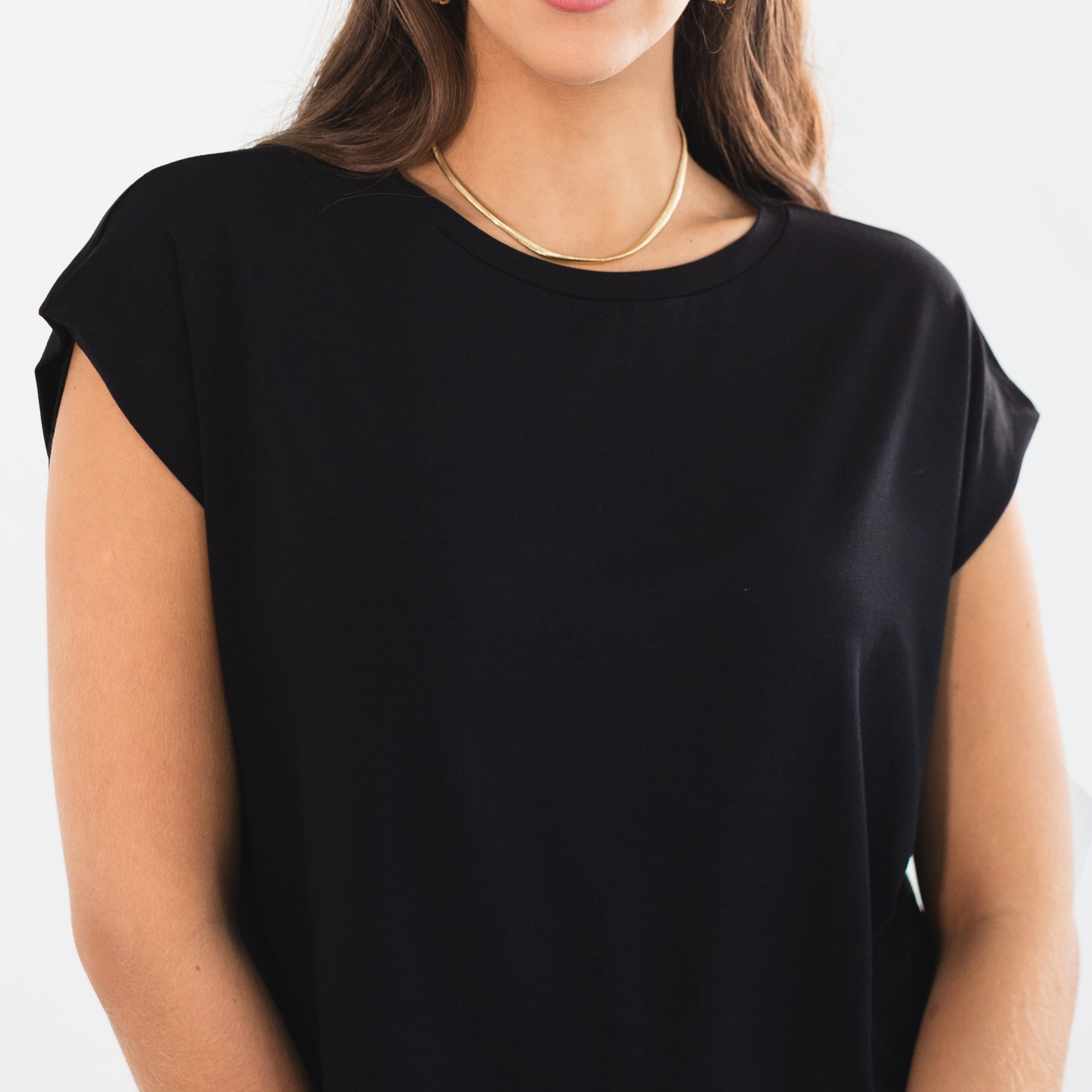 o ombro integrado cria um visual mais limpo e atual, além de deixar o vestir muito mais confortável — nada apertando, nada marcando, só fluidez. a prega nos ombros cria uma estrutura sutil que valoriza a silhueta, e o decote arredondado traz equilíbrio e elegância na medida certa.