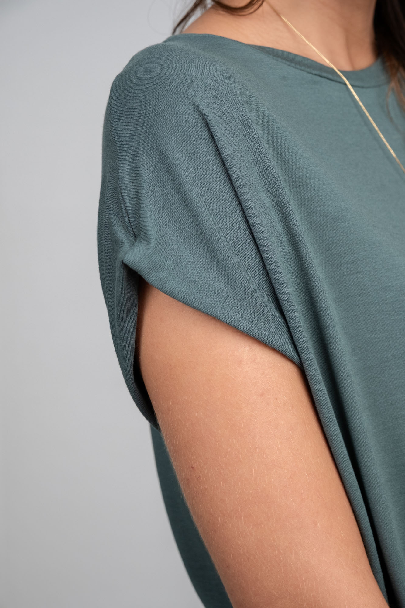 o ombro integrado cria um visual mais limpo e atual, além de deixar o vestir muito mais confortável — nada apertando, nada marcando, só fluidez. a prega nos ombros cria uma estrutura sutil que valoriza a silhueta, e o decote arredondado traz equilíbrio e elegância na medida certa.