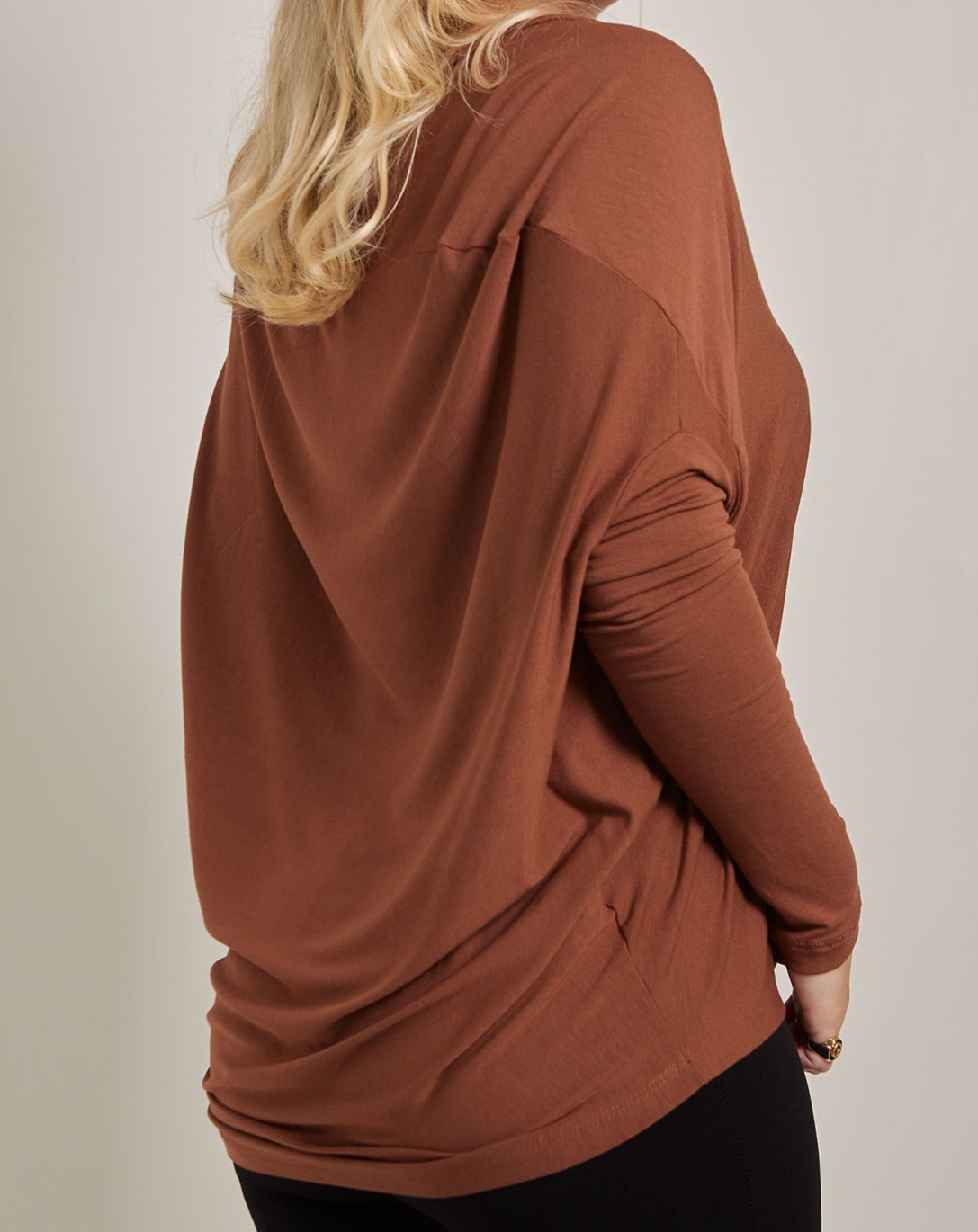 a modelagem é no estilo morcego, mais ampla na parte de cima e ajustada nos braços, o que cria um caimento suave e um desenho bonito no corpo — sem marcar. é o tipo de corte que respeita todos os corpos e se adapta ao seu movimento natural.