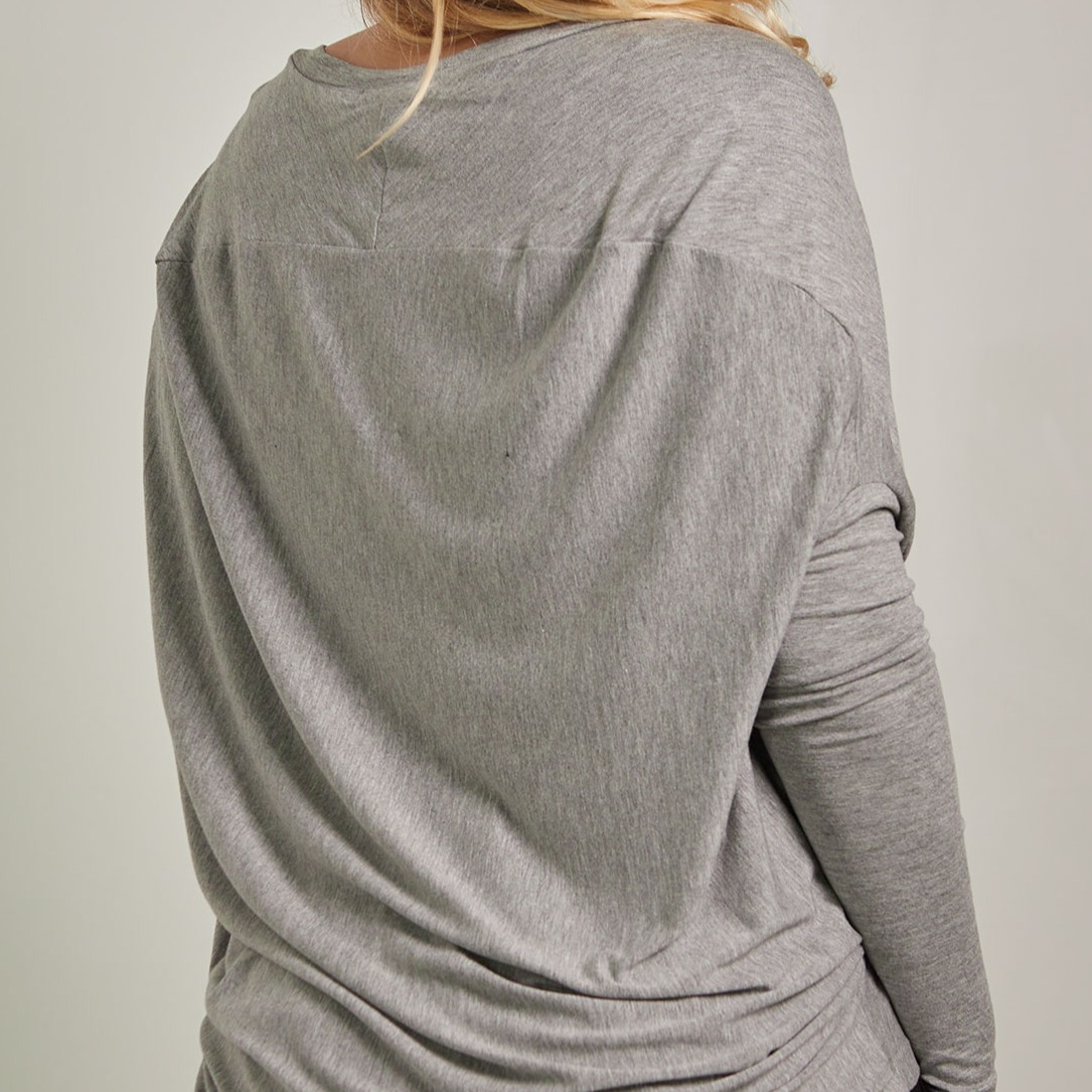 a modelagem é no estilo morcego, mais ampla na parte de cima e ajustada nos braços, o que cria um caimento suave e um desenho bonito no corpo — sem marcar. é o tipo de corte que respeita todos os corpos e se adapta ao seu movimento natural.