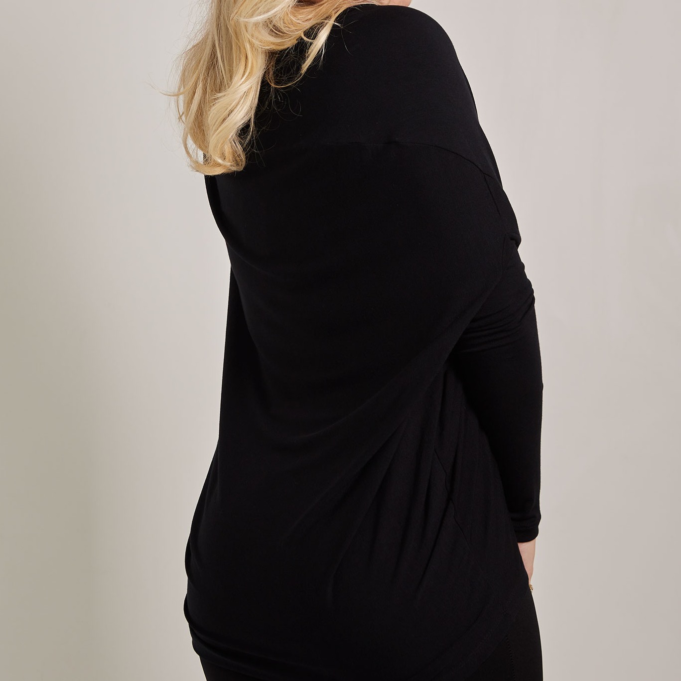 a modelagem é no estilo morcego, mais ampla na parte de cima e ajustada nos braços, o que cria um caimento suave e um desenho bonito no corpo — sem marcar. é o tipo de corte que respeita todos os corpos e se adapta ao seu movimento natural.