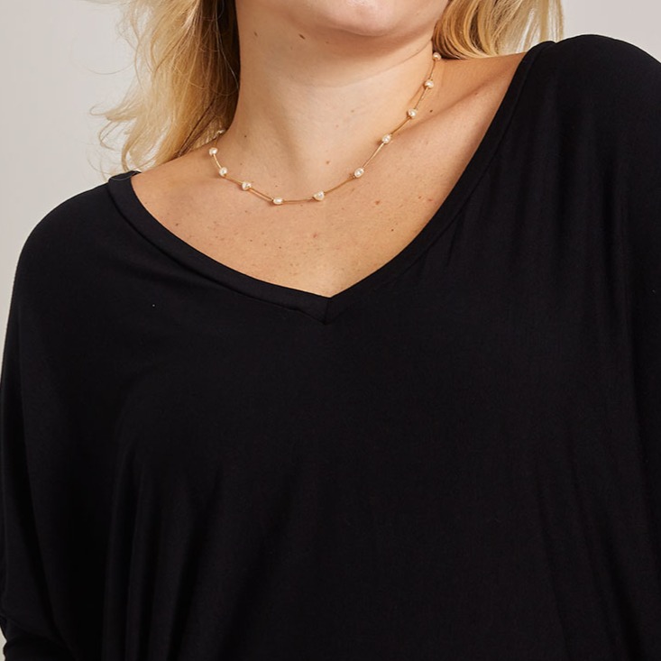 o decote V abre o colo com delicadeza, sem exagero, e combina com diversos estilos de acessórios ou sobreposições.
