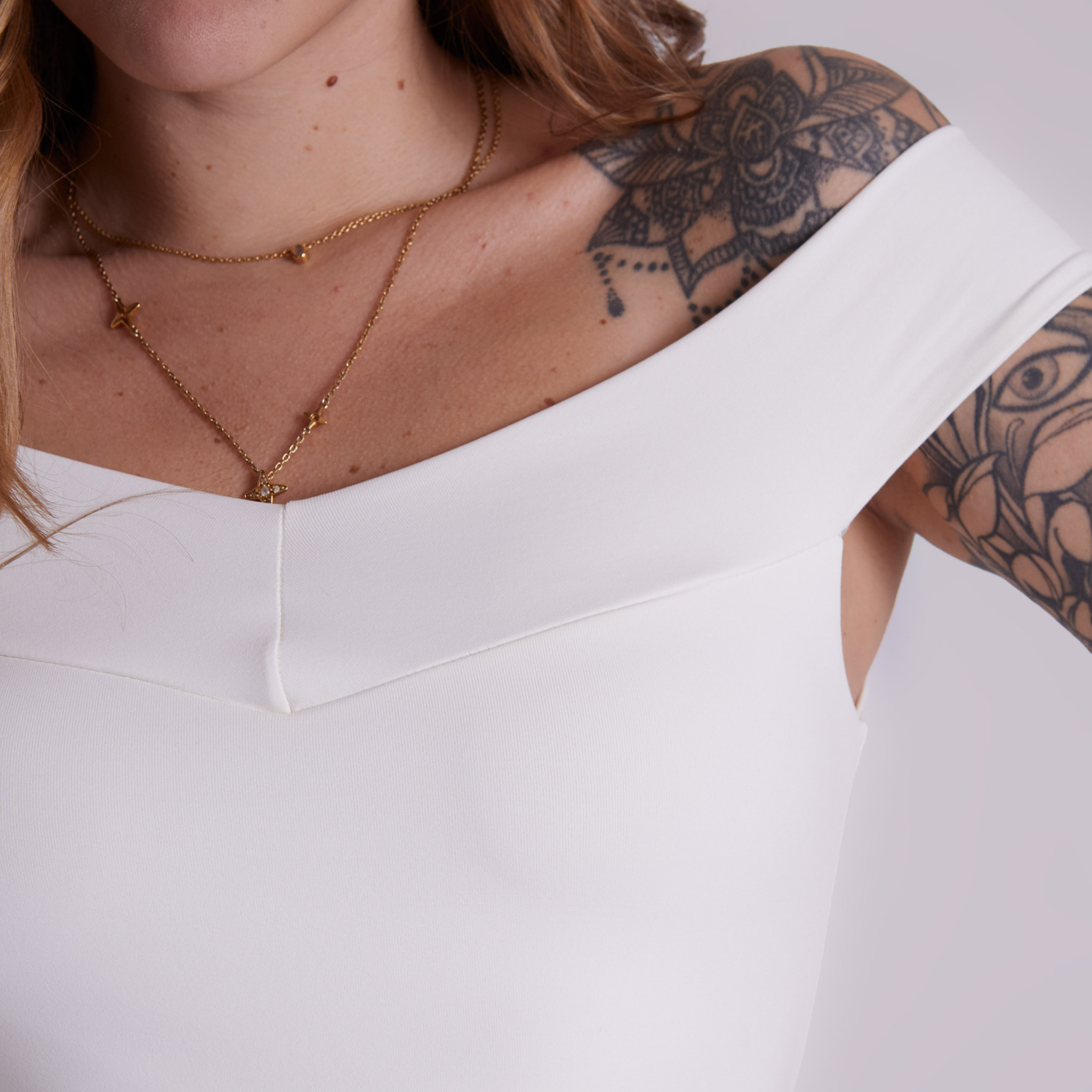 a faixa superior, dobrada estrategicamente, cria um leve recorte em “v” no decote dá uma harmonizada no colo e cria uma estrutura do ombro a ombro que impede que a peça “desça” durante o uso, mantendo tudo no lugar — porque ninguém merece ficar levantando blusa a cada dois passos.