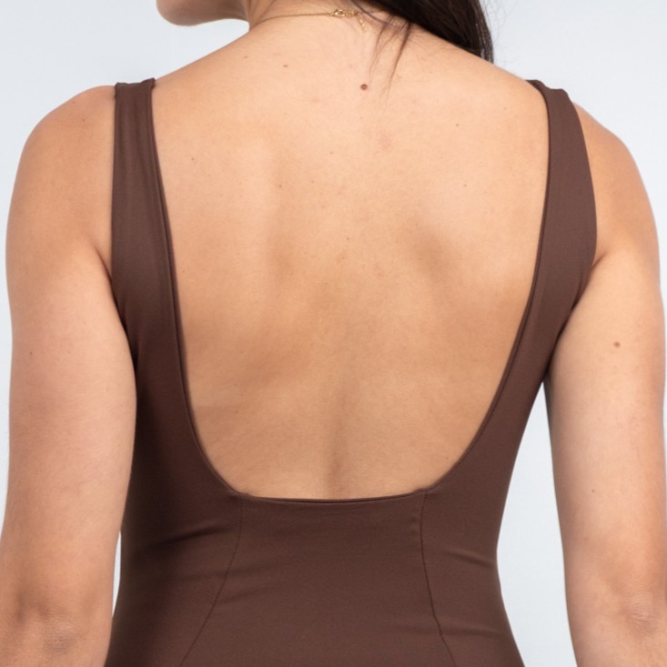 na frente, o desenho é mais limpo, com decote reto e alças largas que sustentam com conforto. nas costas, o decote quadrado mais profundo aparece como um detalhe sutil, mas que muda tudo. possui recortes estratégicos que acompanham a silhueta com naturalidade, valorizando as curvas e proporcionando um encaixe confortável ao corpo.