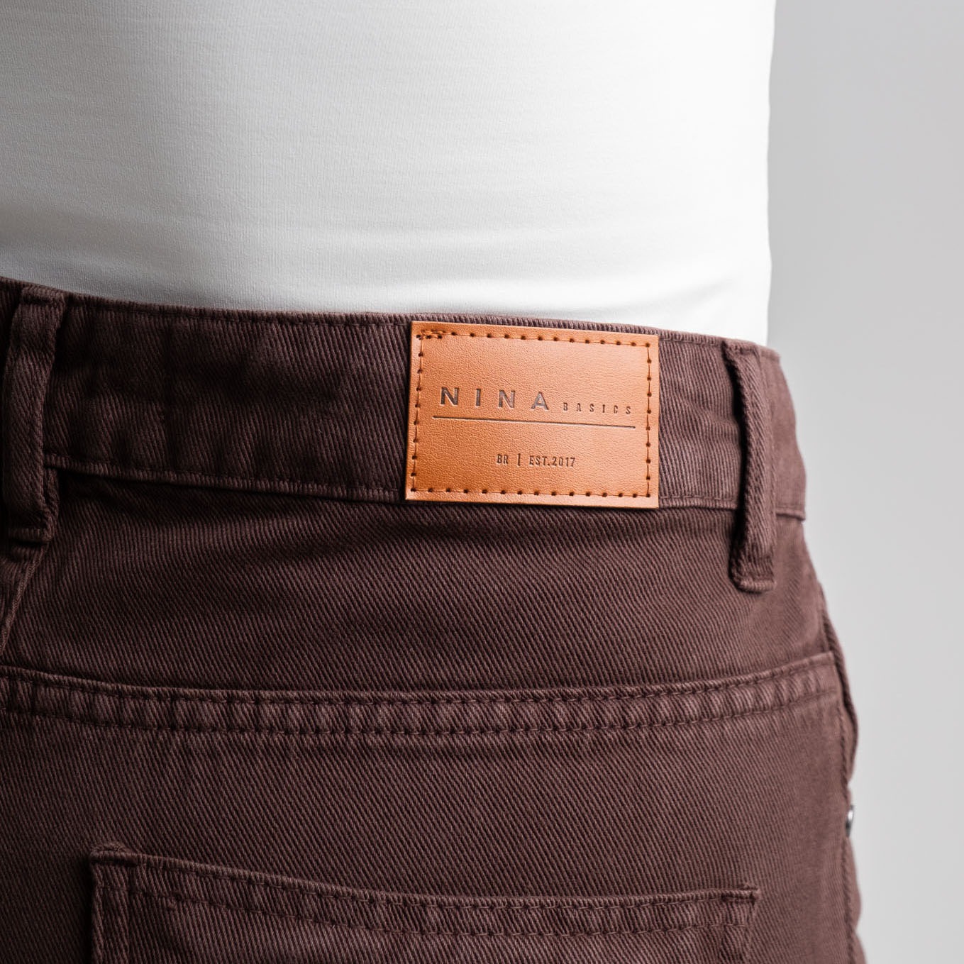 botão frontal e tag traseira com gravação exclusiva nina basics — pequenos detalhes que carregam a identidade da marca. |