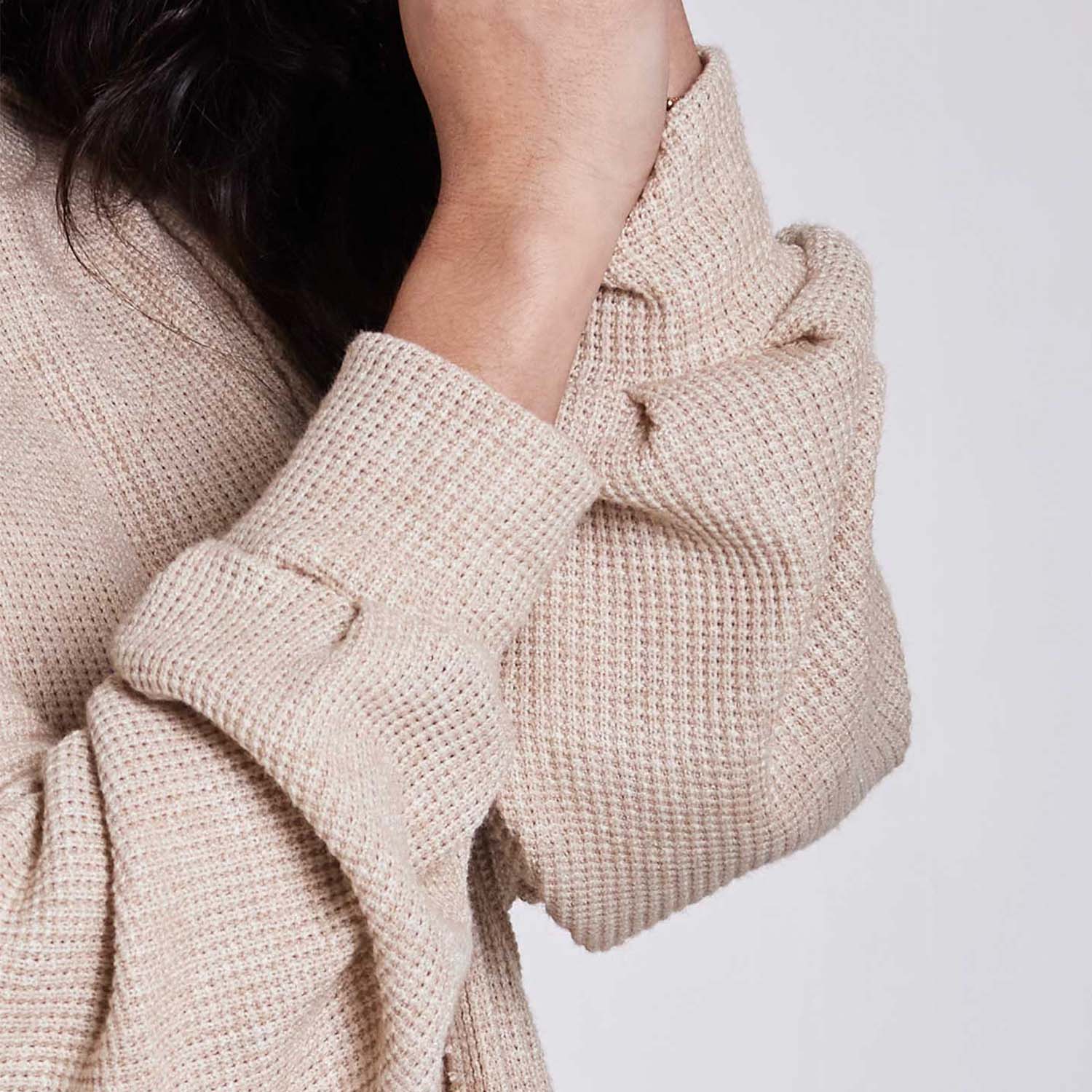 tricot com ponto marcante a trama aberta do tricot, com ponto aparente e estrutura firme, dá peso visual à peça e traz um toque macio