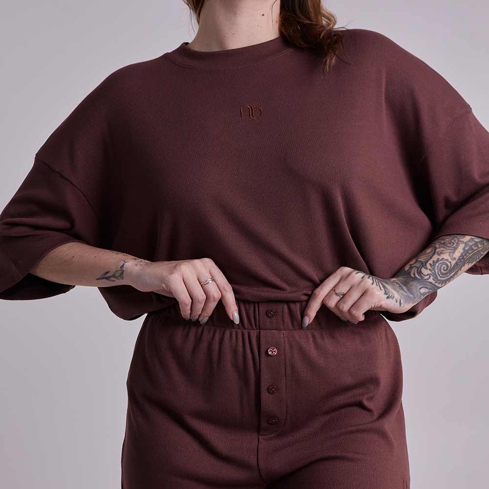 a blusa de modelagem oversized tem gola redonda e mangas amplas — o que cria um equilíbrio entre descontração e elegância — e permite usar por dentro, por fora ou até como mini dress em casa (sim, liberdade total). o short tem cintura alta com elástico confortável, caimento soltinho e botões personalizados decorativos frontais que agregam muito mais valor à peça, junto ao bordado minimalista que aparece sutilmente no peito e na perna, como assinatura de estilo.