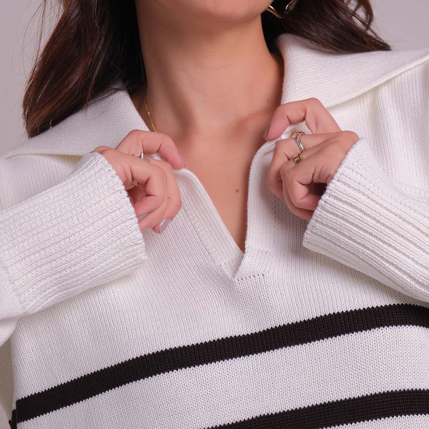 um clássico que nunca decepciona. com gola polo estruturada e listras clássicas, a lavinia é aquele tricot encorpado que veste com conforto e esquenta de verdade (sem pinicar, prometo).