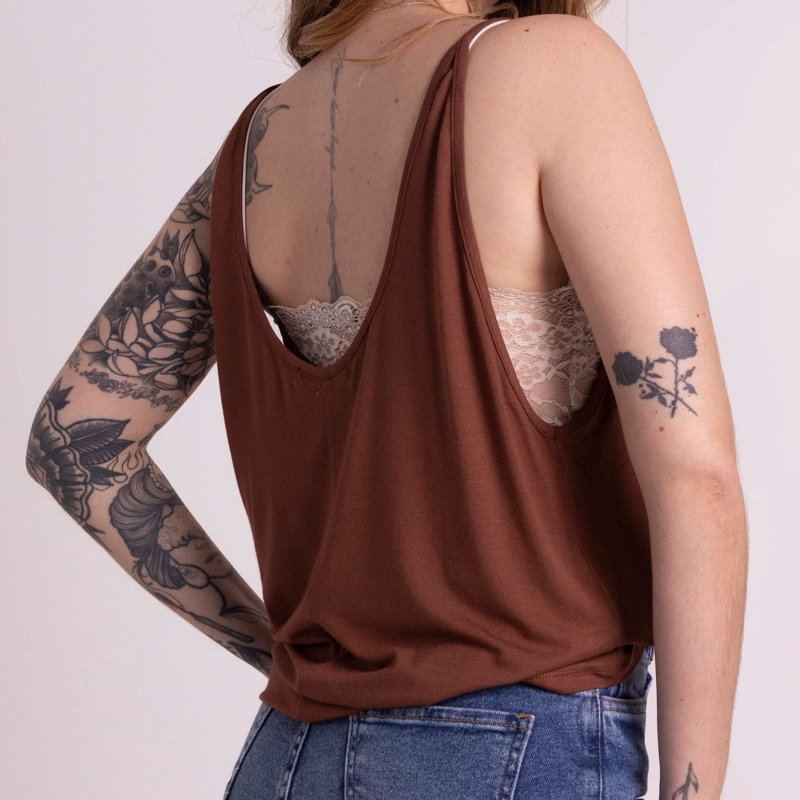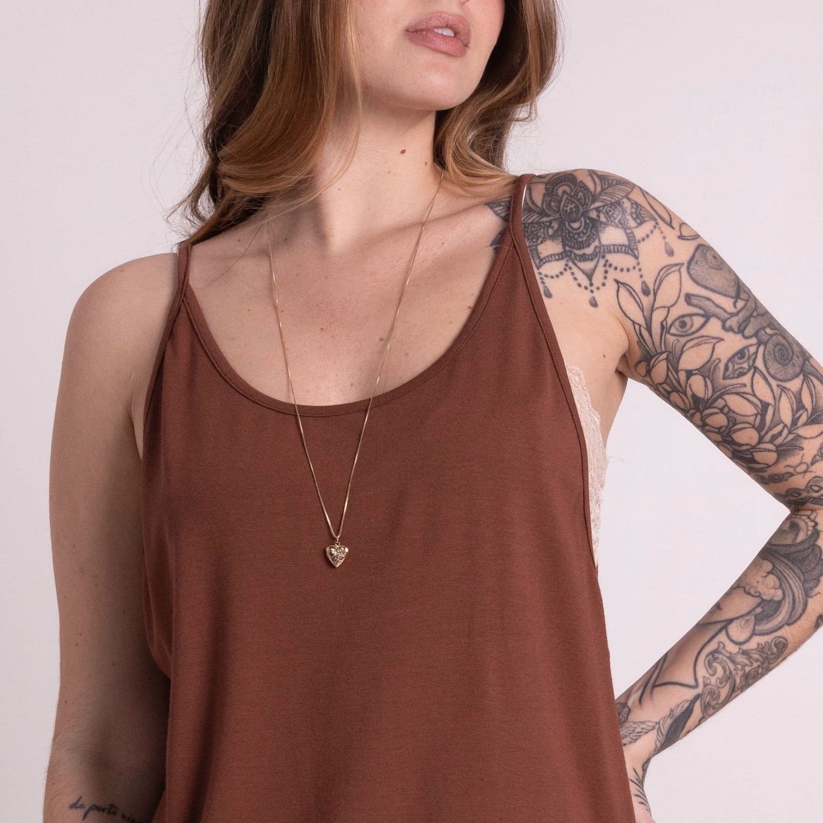 o decote profundo nas costas e as cavas amplas trazem uma sensualidade leve, ideal pra usar com o nosso top renda triângulo ou com tops lisos pra um visual mais casual. o modelo cavado garante frescor e mobilidade, sendo ideal para os dias mais quentes.