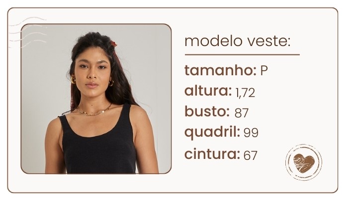 ![]() | COMPRIMENTO PERFEITO A Regata Cropped Samia é ideal para quem ama a tendência cropped, mas prefere não mostrar a barriga. Com um comprimento cuidadosamente pensado, ela oferece cobertura suficiente para se sentir à vontade, mantendo o visual moderno e despojado. |