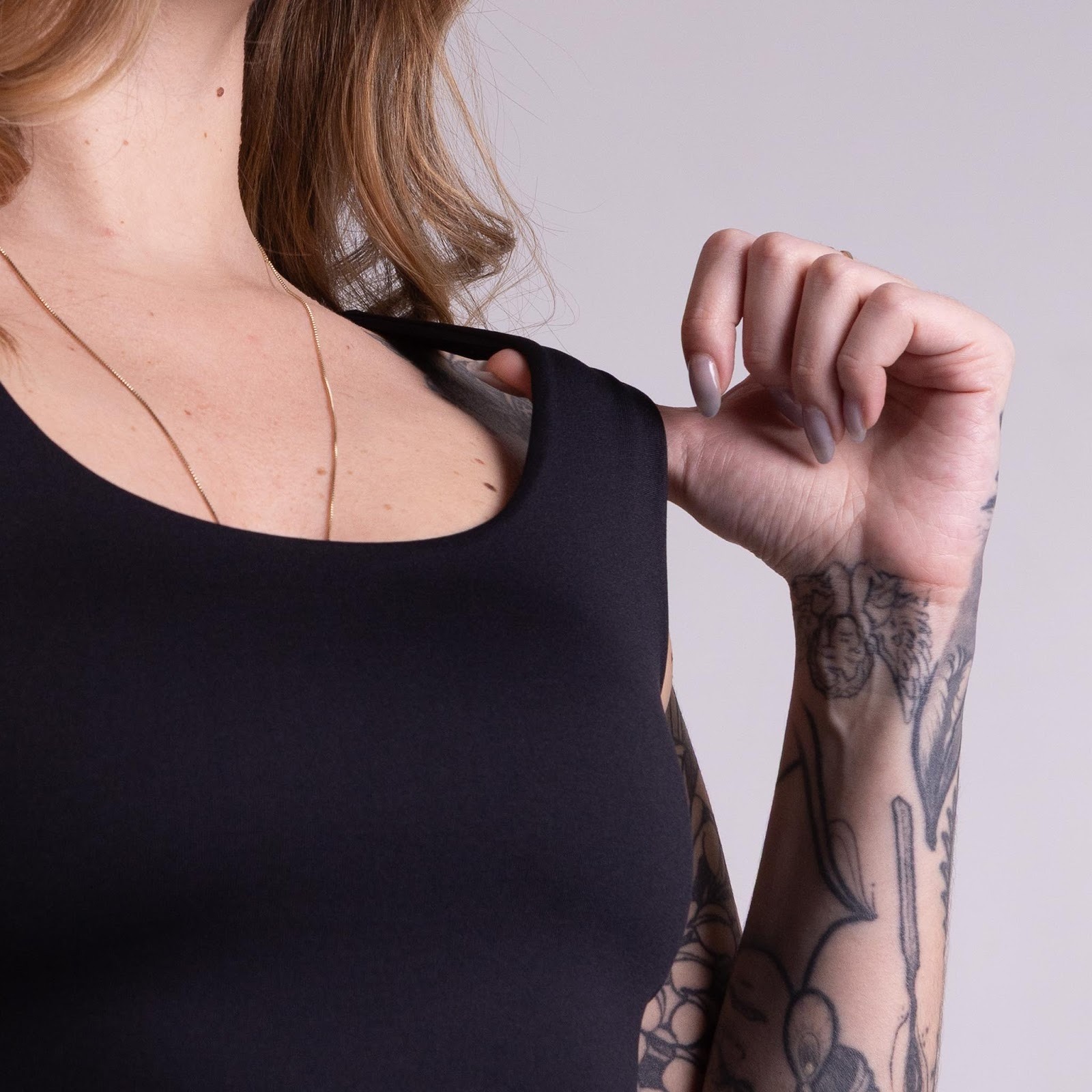 sua dupla camada de tecido cria uma peça que veste com estrutura. o comprimento é ideal pra quem busca uma regata que se acomoda bem dentro da calça ou saia, sem subir, mantendo o look sempre no lugar.