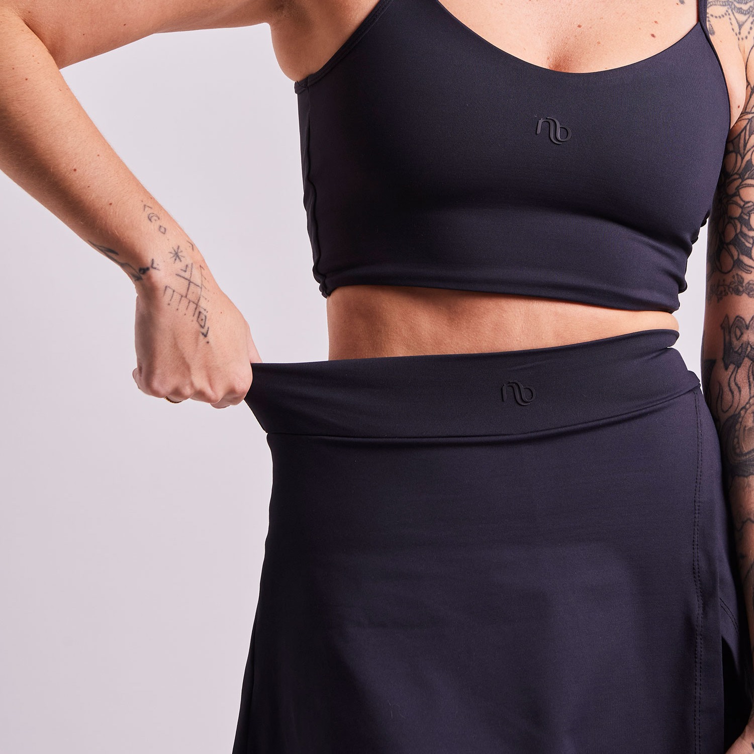 o design é de short saia, com saia completa na frente e nas costas, sem recorte central atrás, garantindo cobertura total e um visual equilibrado. na frente, a modelagem levemente transpassada cria fluidez e movimento, deixando a peça mais feminina e interessante.