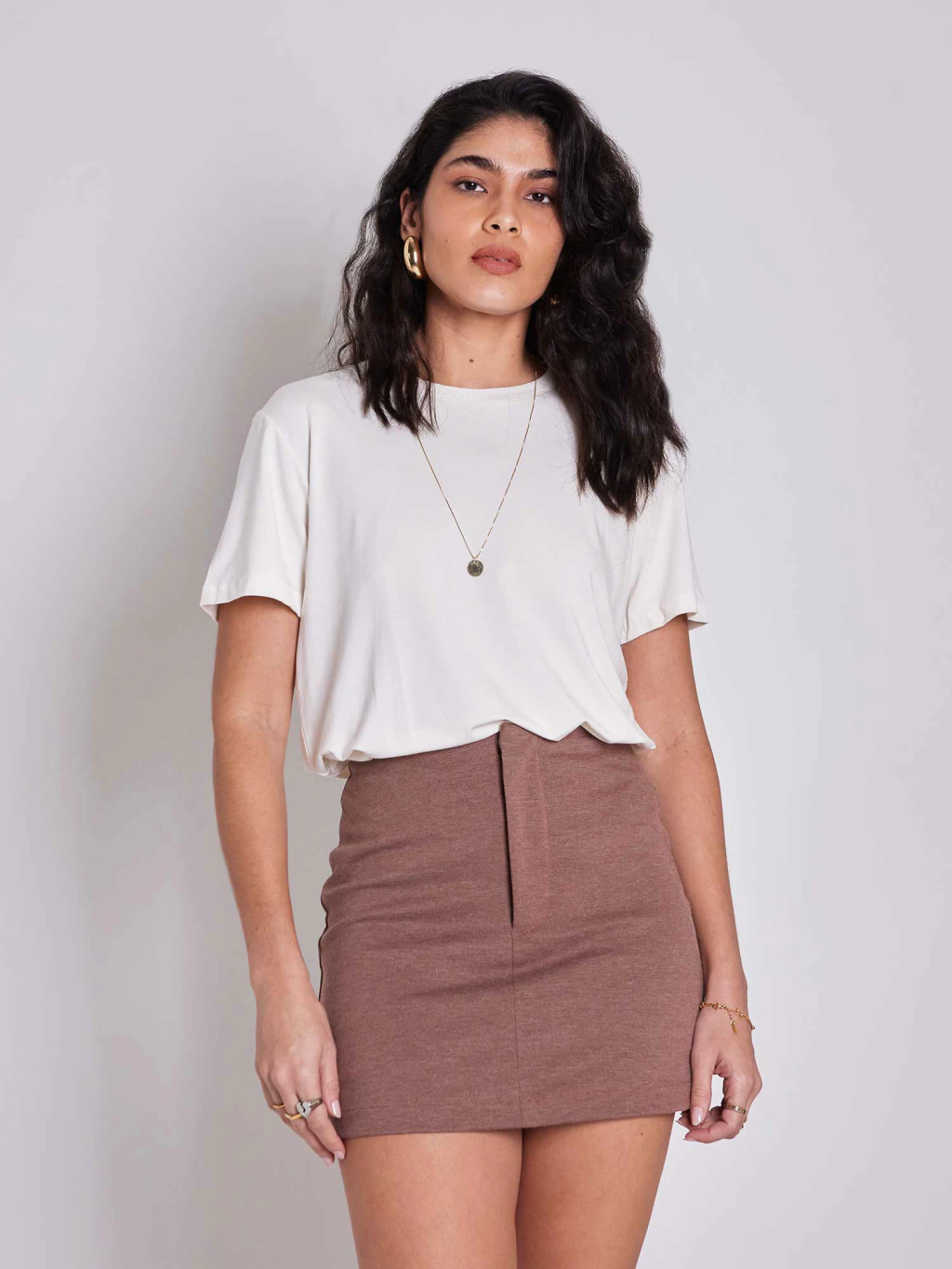 disponível em 3 cores neutras e versáteis, a t-shirt lisa funciona sozinha ou como base pra camadas de looks casuais a produções mais elaboradas, ela entrega estilo sem esforço — todos os dias da semana.