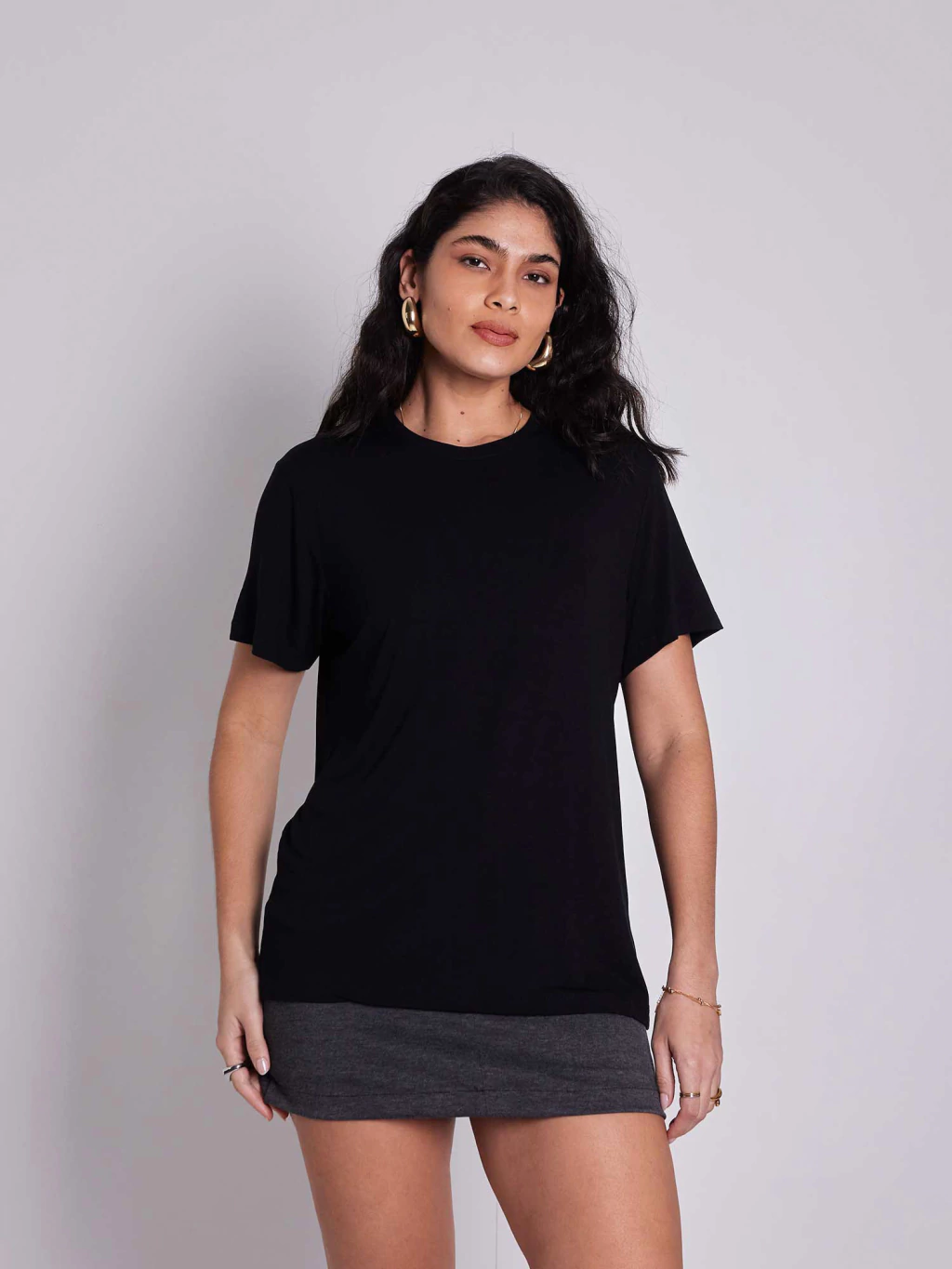 a t-shirt lisa é o tipo de peça que a gente coloca no corpo e não quer mais tirar. ela tem o caimento soltinho, com comprimento confortável e modelagem que funciona com tudo — calça, saia, shorts, por dentro, por fora, amarrada... o mood quem define é você.