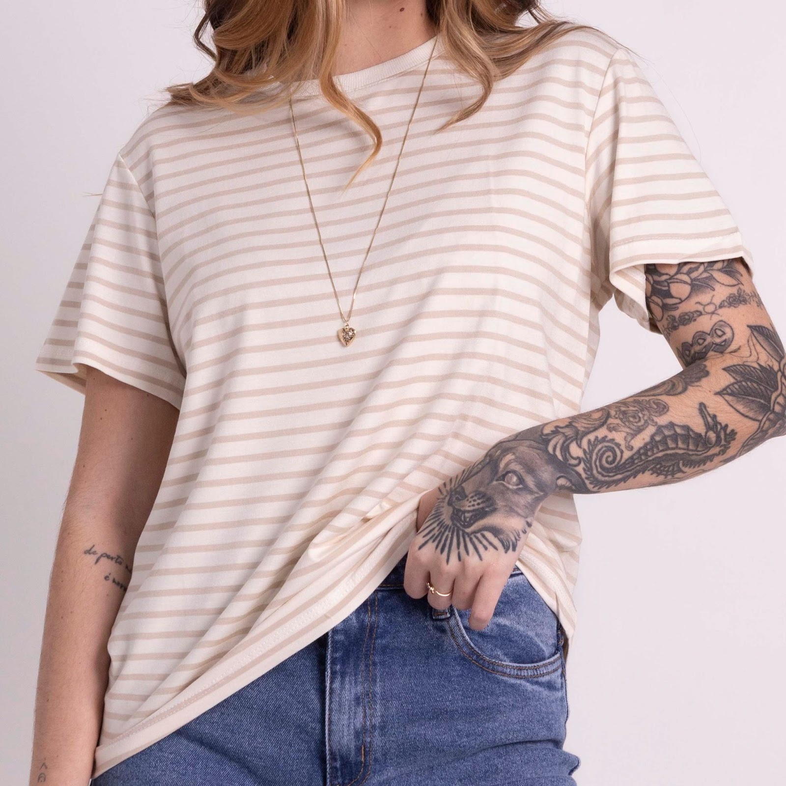 a yasmin é o tipo de t-shirt listrada que salva qualquer look. simples, mas nunca sem graça — tem aquele equilíbrio entre o básico e o cool que faz dela uma das favoritas das niners.