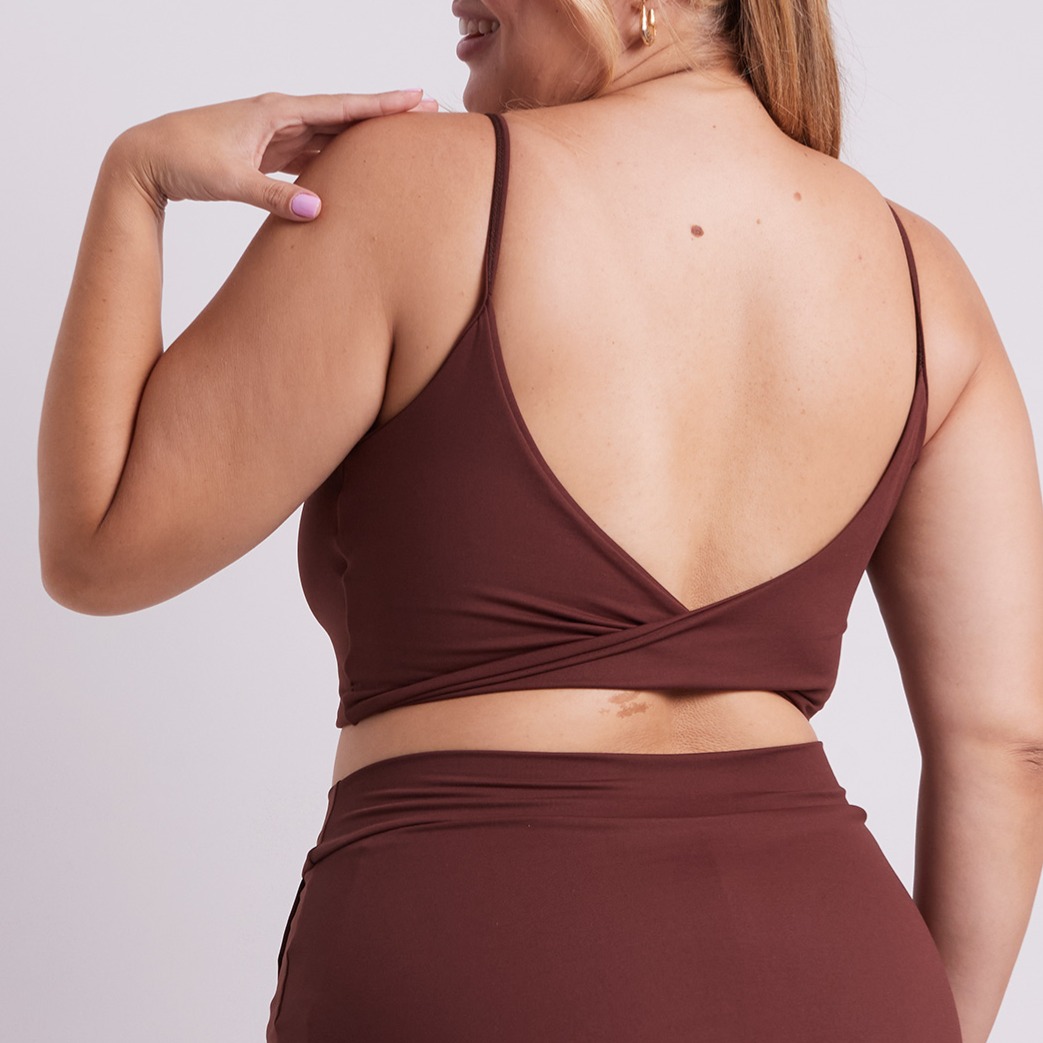 agora as costas… são o charme, alças cruzadas com efeito torcido e um decote mais profundo que deixa as costas bem abertas. além de lindo, ajuda na ventilação e dá mais conforto térmico quando o treino esquenta.