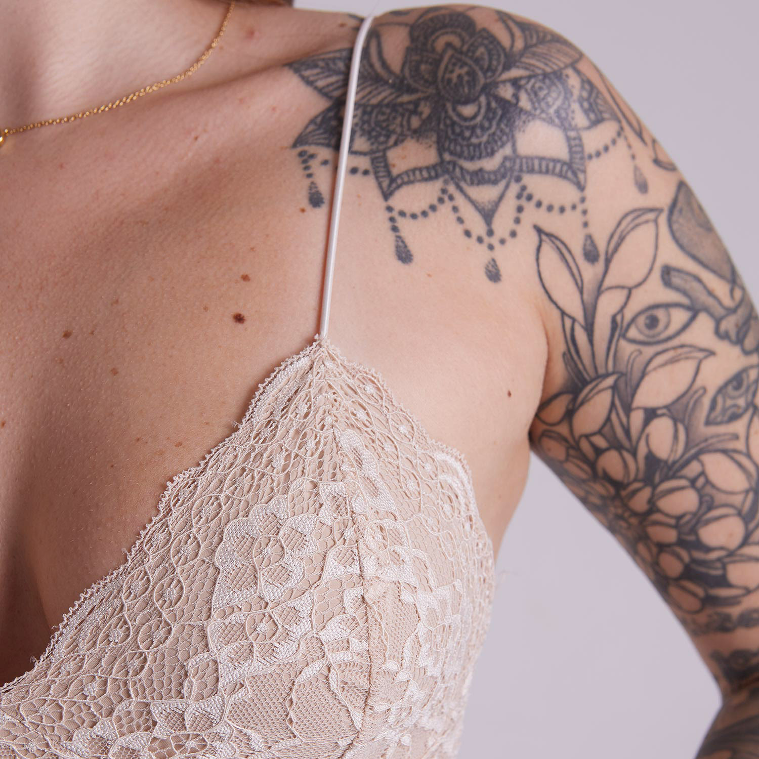 > use com a regata cavada viscotricot, criando um contraste lindo entre o caimento leve e a renda delicada.