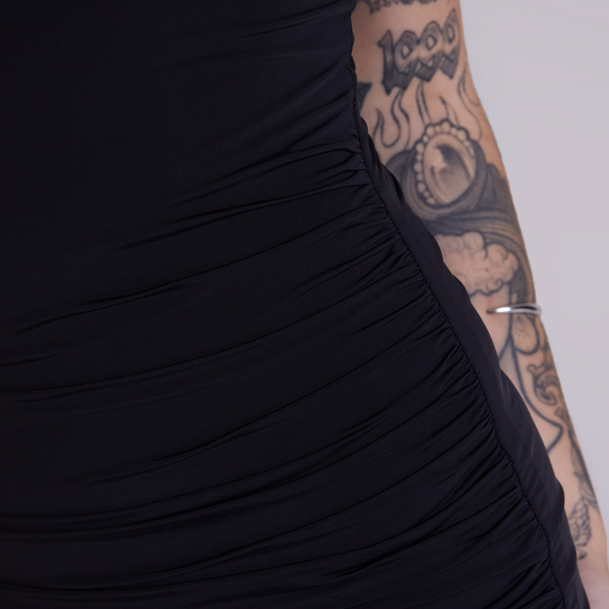 com comprimento curto, leve e que modela o corpo com suavidade, ele une conforto real com um visual marcante. o drapeado lateral cria um franzido que desenha o abdômen e o quadril sem esforço, dando um toque moderno e cheio de personalidade.