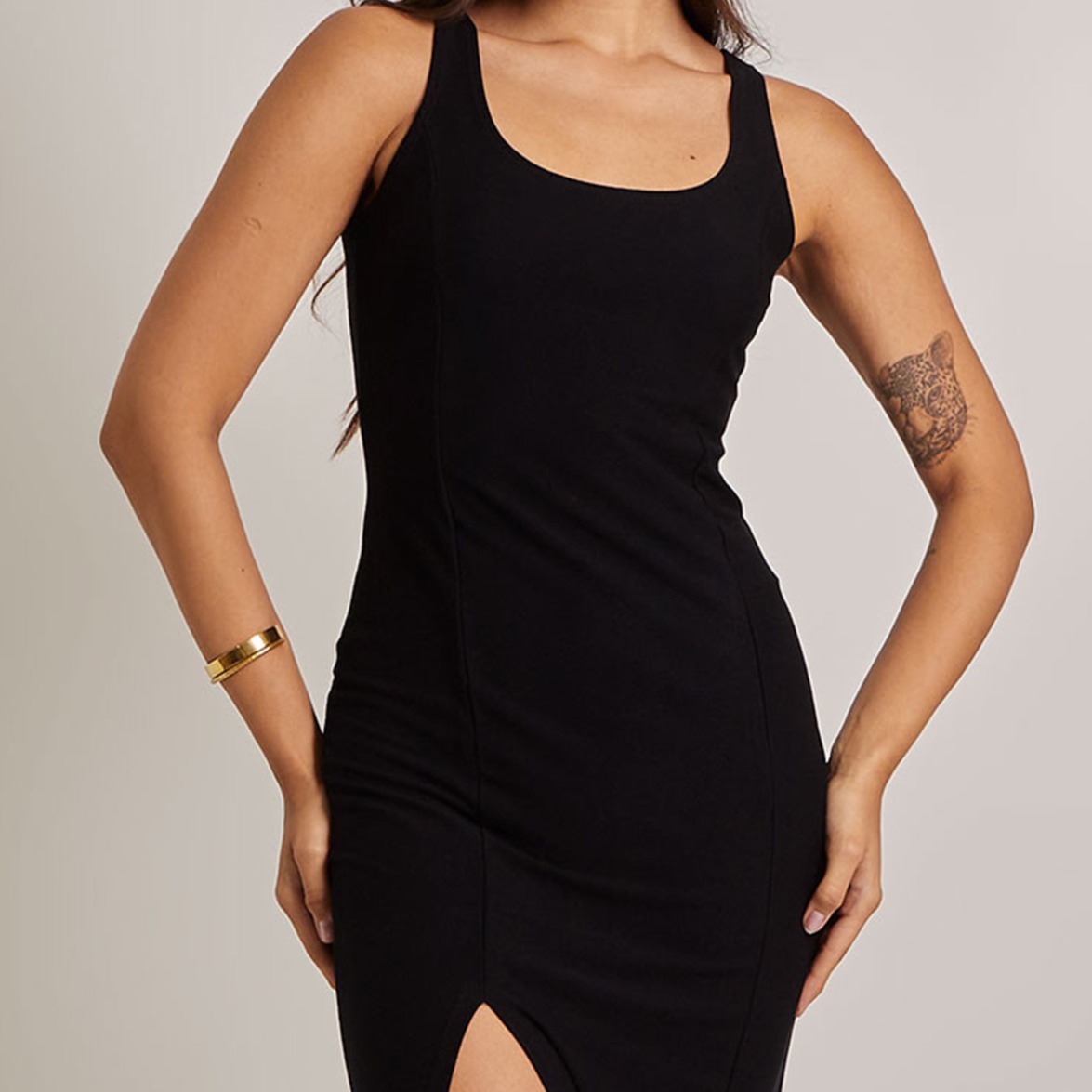 a modelagem ajustada acompanha a silhueta com suavidade, valorizando as curvas sem marcar. já a fenda frontal entra como ponto de destaque: traz movimento ao caminhar, leveza no visual e um toque de sensualidade.